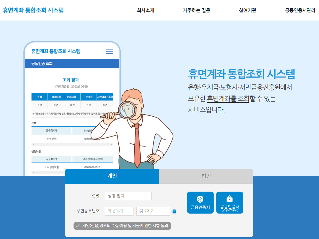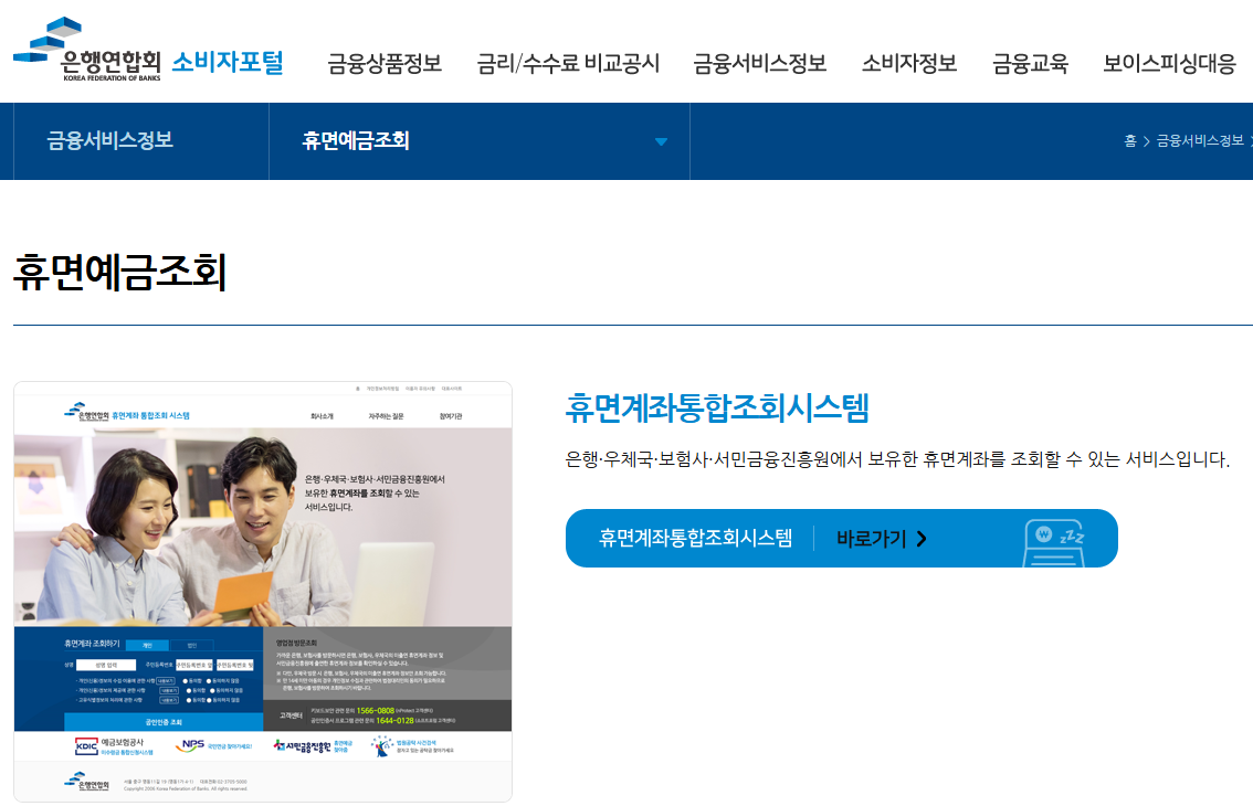 금융감독원에서 제공하는 '휴면계좌 통합조회 시스템' 바로가기
